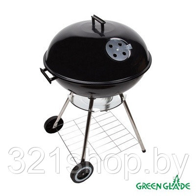 Гриль -барбекю Green Glade AK22FP (22022A) круглого сечения на колесиках, с крышкой, с пластиковыми ручками, 2-мя нижними полочками, 2-мя регуляторами подачи воздуха, высотой 86 см, с диаметром 53 см, на 4-х ножках, с крышкой черного цвета.